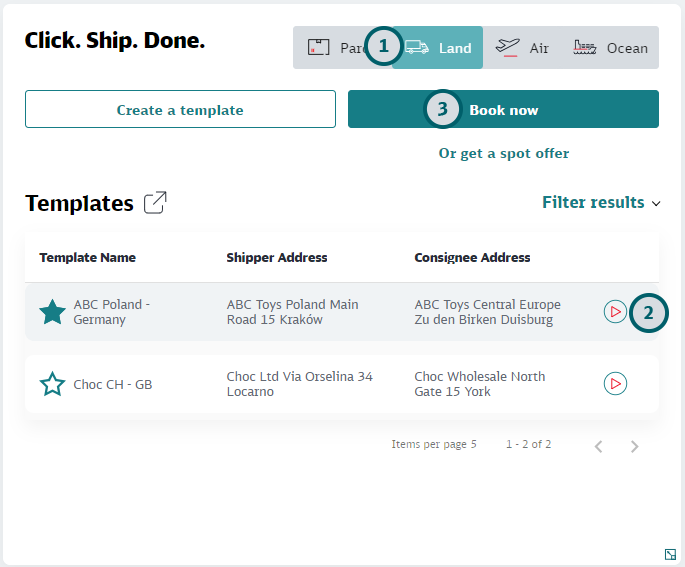 Click on Land to start a Land booking.