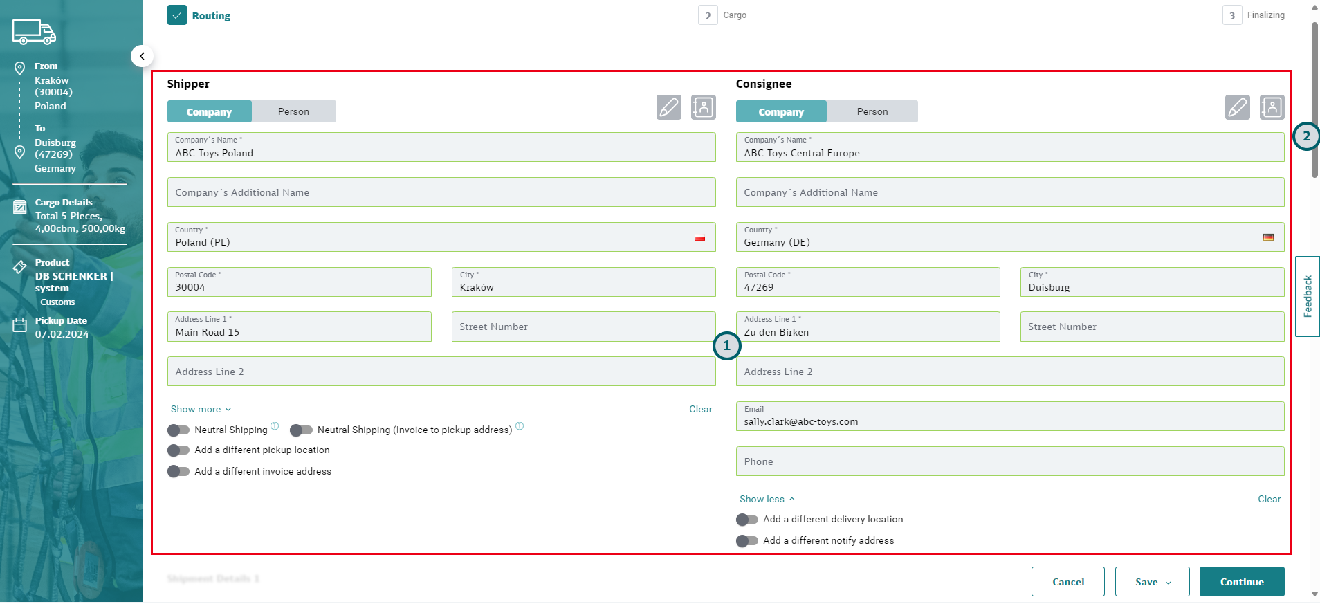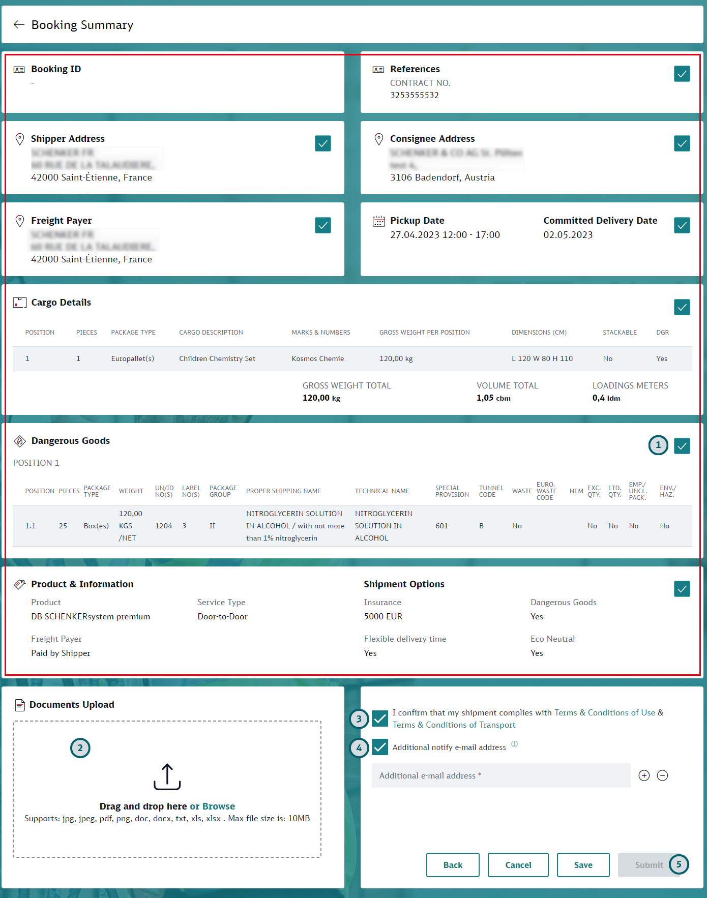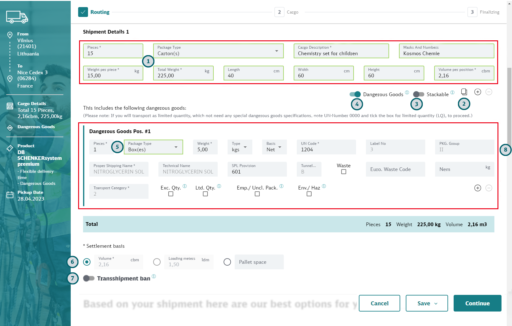 Cancel: Click “Cancel” to leave the booking without saving. You can select to go to the DB Schenker | connect dashboard or to My Shipments.
