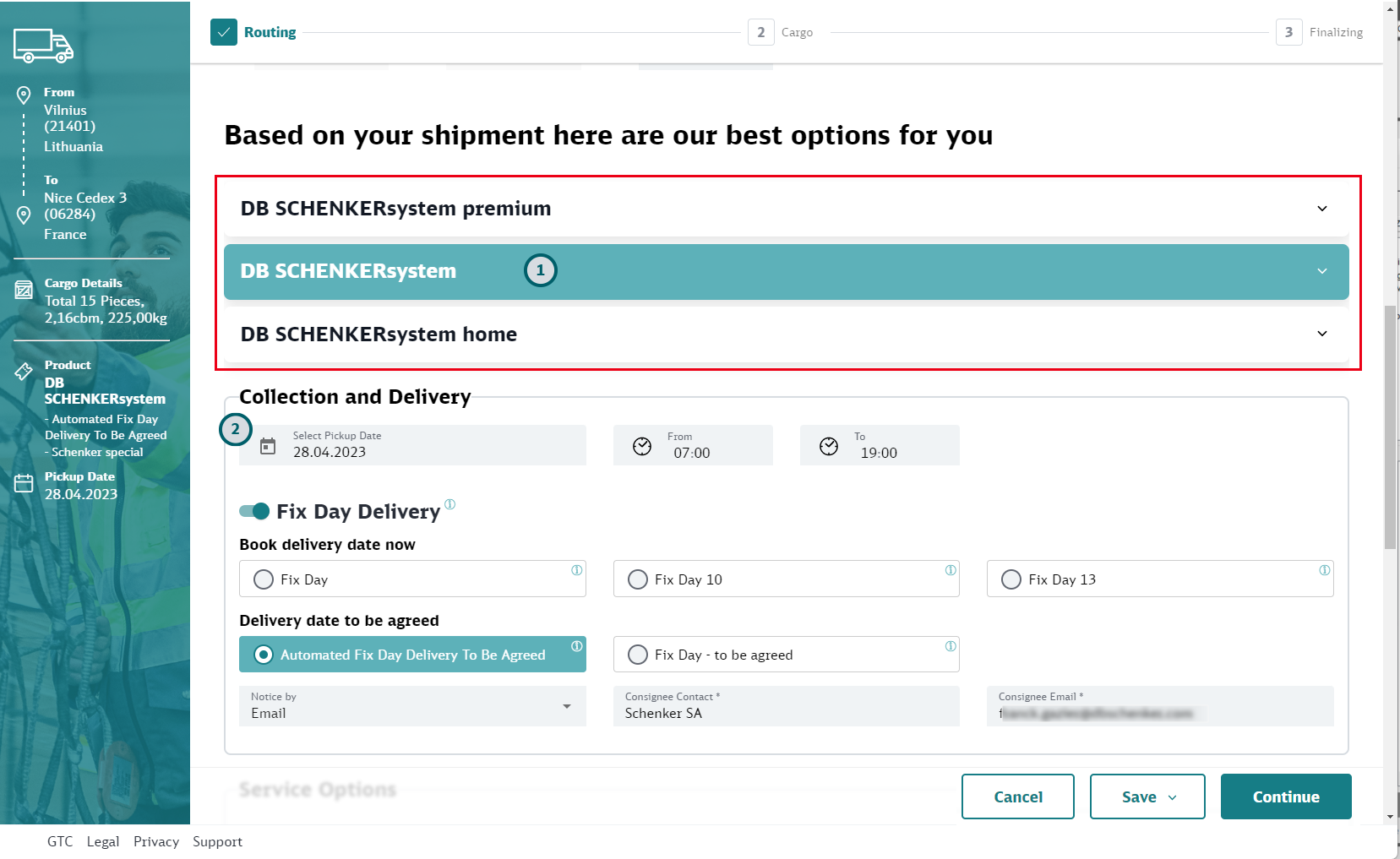 Based on the cargo details you have entered, all suitable Schenker products are shown. Select one of them.