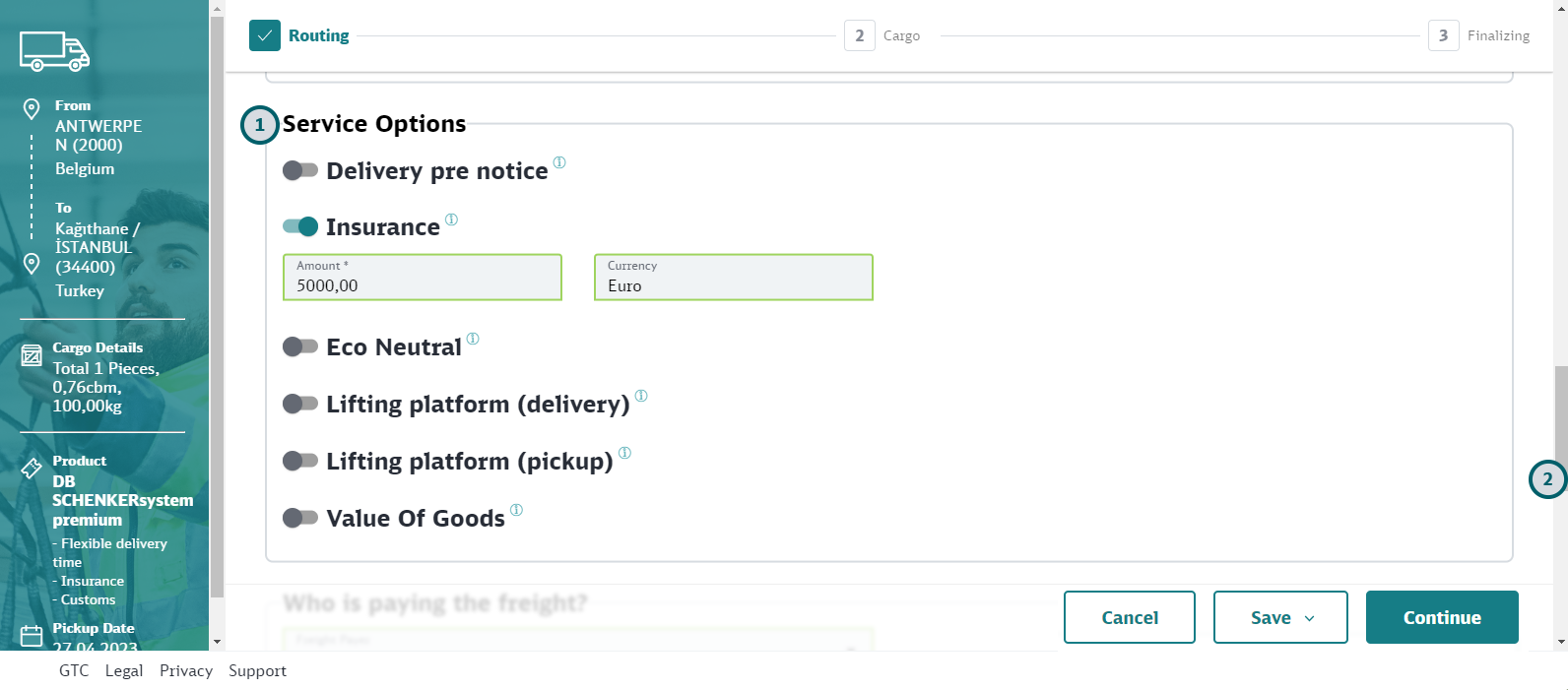 Use the toggle button to define the service options for the booking. Depending on the option selected, you may have to enter additional information (for example, if you select "Insurance" as an option, you must specify the insurance amount).